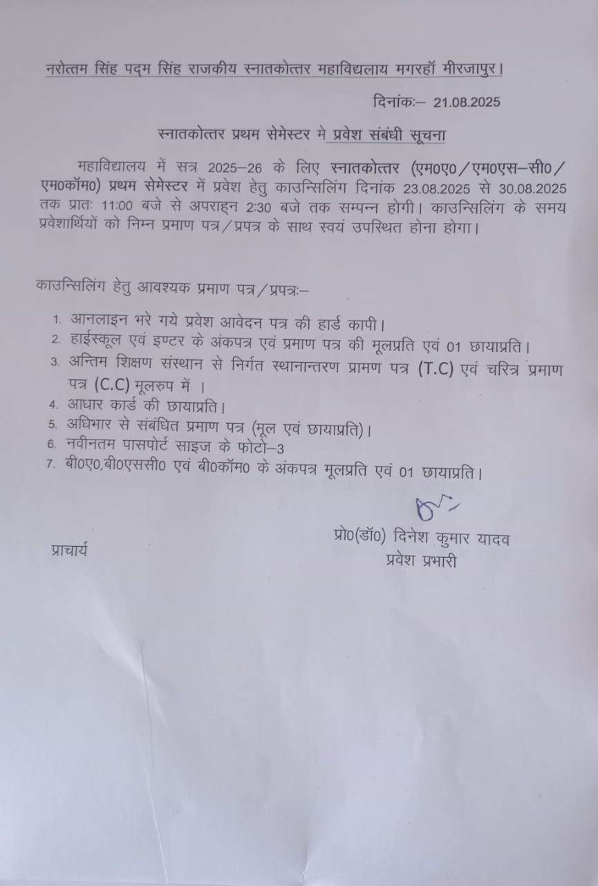 स्नाकोत्तर प्रथम सेमेस्टर में प्रवेश संबंधी सूचना